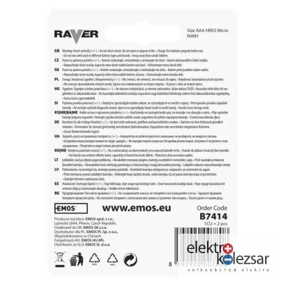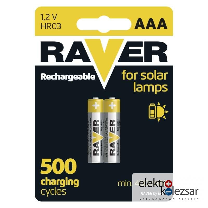 chemické složení: NiMH|hmotnost: 9 g|kapacita: 400 mAh|kategorie/řada: Solar|max. skladovatelnost: neuvádí se|možnost nabíjení: ano|napětí: 1,2 V|počet nabíjecích cyklů: více než 500|prodejní obal: 2 ks, blistr|provozní teplota: -20 °C až +50 °C|rozměr: 10,5 × 44,5 mm|typ: HR03 (mikrotužka, AAA)|velikost baterie: AAA|značka: Raver