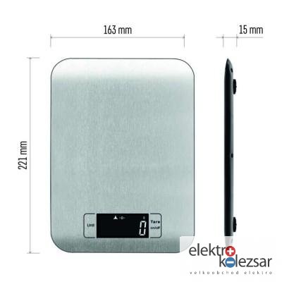 automatické vypnutí: po 2 minutách|barva: stříbrná|Bluetooth: ne|BMI index – měření tuku, vody a svalové hmoty: ne|další funkce: –|funkce dovažování: ano|indikace slabých baterií: ano|indikátor přetížení: ano|jazyky aplikace: –|jednotky váhy: g, oz, lb, kg|kompatibilita: –|LCD displej: ano|max. zátěž: 5 kg|napájení: 2× 3 V CR2032 (součástí balení)|notifikace do mobilní aplikace: –|ovládání hlasovými asistenty: –|paměť: ne|podporované OS: –|podsvícený displej: ano|povrch váhy: nerez|přenosová frekvence: –|přesnost vážení: 1 g|prodejní obal: 1 ks, krabička|produkt: kuchyňská váha|protokol: –|rozměr: 15 × 163 × 221 mm