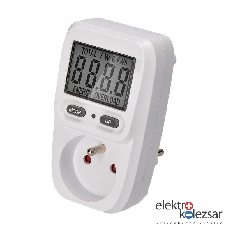Měřič spotřeby elektrické energie s přehledným LCD displejem o úhlopříčce 2" (5 cm) umožňuje měření spotřeby až do 9999 kWh s příkonem v rozmezí 2W až 3680W/16A. Disponuje nastavením ceny za energii, dvěma tlačítky pro snadnou obsluhu, funkcí přesného výpočtu ceny a měření spotřeby. Obsahuje dětskou pojistku, indikaci překročení maximálního příkonu ("overload") a měří elektrické veličiny, jako je napětí a okamžitý odebíraný výkon. Integrovaný stabilizátor napětí zajišťuje přesnost měření s odchylkou do ±1,5 %. Pracovní teplota se pohybuje mezi 0 až +50 °C. Napájení je AC 230V, 50Hz.