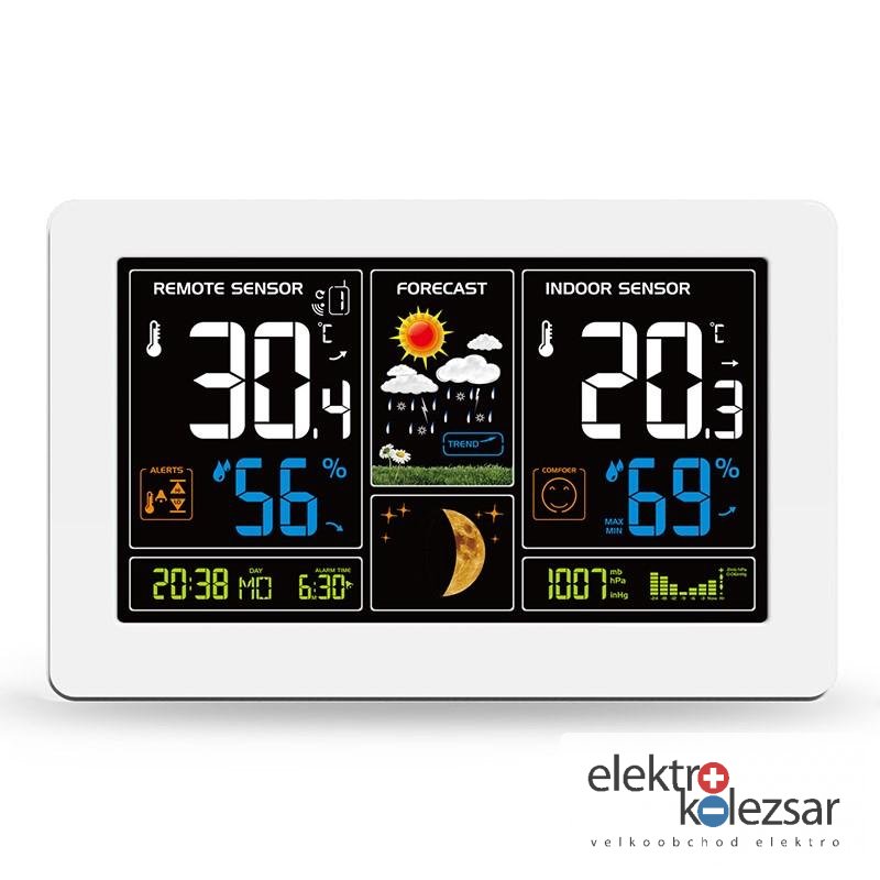 Tato meteostanice je ideálním řešením pro sledování počasí jak uvnitř, tak venku. Měří vnitřní teplotu v rozmezí 0°C až +50°C, venkovní teplotu od -20°C až +60°C, a vlhkost jak uvnitř (20% - 95%), tak venku. Dále měří atmosférický tlak (600 hPa/mb - 1100 hPa/mb) a poskytuje přesnou předpověď počasí ve 6 grafických úrovních. Umožňuje připojení až 3 bezdrátových senzorů s dosahem až 60 m ve volném prostoru a funkci cyklického přepínání mezi senzory. Meteostanice nabízí úsporný režim displeje s 5 úrovněmi podsvícení, což zajišťuje optimální čitelnost. Je vybavena rádiově řízeným časem, kalendářem, fázemi Měsíce a budíkem s možností odložení. Paměť minimálních a maximálních hodnot pro teplotu a vlhkost je automaticky uložena pro obě měřené oblasti, což vám umožňuje snadno sledovat historická data.Barevný podsvícený displej o velikosti 7,5" (17,0 x 9,4 cm) poskytuje rychlý a pohodlný přístup k ovládacím tlačítkům na boční hraně. Meteostanici lze pověsit na zeď nebo postavit na opěrný stojánek. Napájení zajišťuje adaptér AC 230V nebo DC 5V (součástí balení), a pro provoz jsou potřeba 2 x AA baterie pro hlavní jednotku a senzor.Tato stanice je praktickým a stylovým doplňkem pro každou domácnost nebo kancelář, který vám poskytne přesné a aktuální informace o počasí a pohodlí.