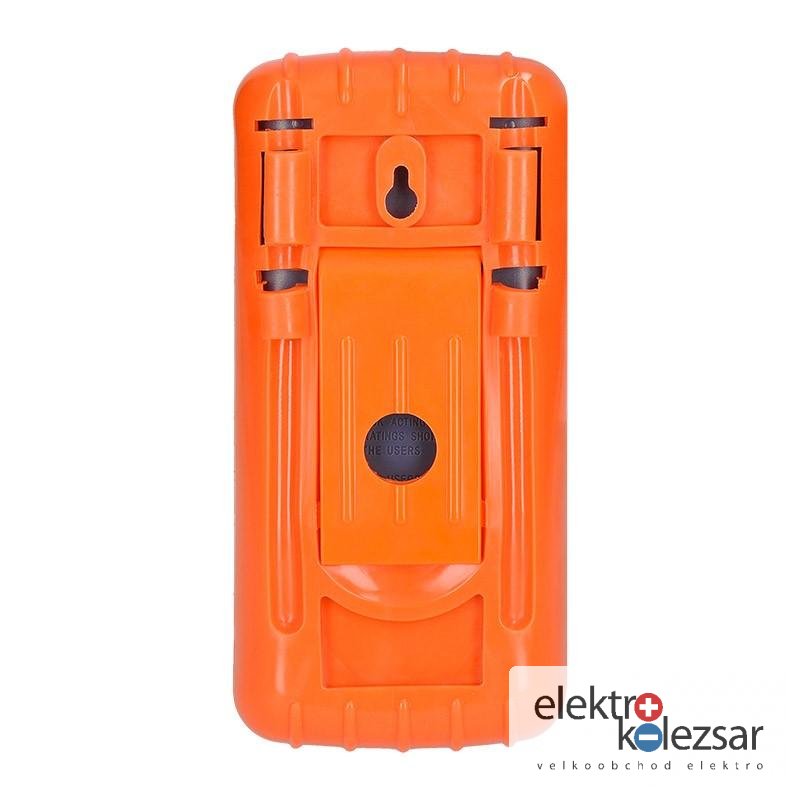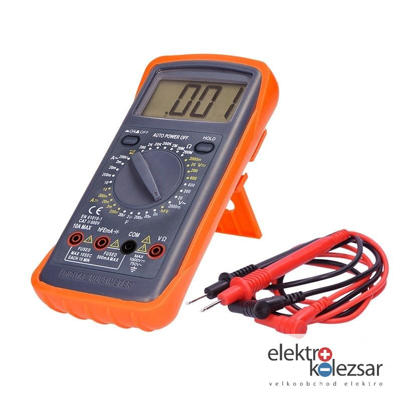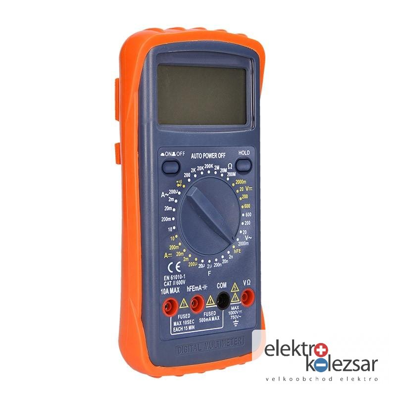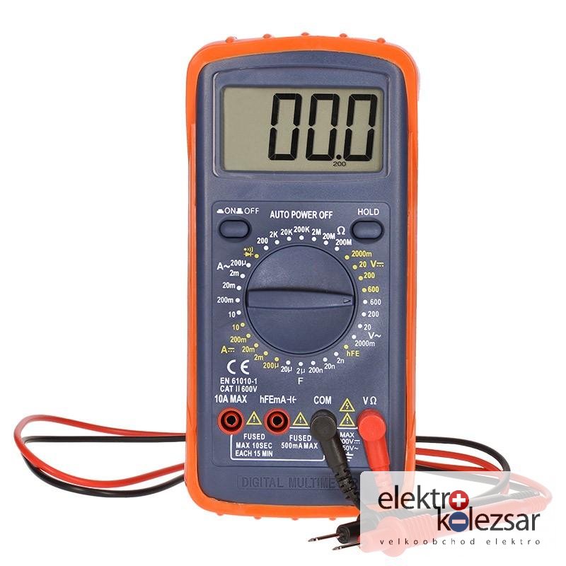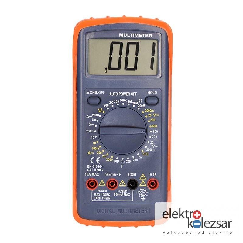 Digitální multimetr pro měření napětí, proudu, odporu a kapacity. Nabízí test spojitosti obvodu, diodový test a měření hFE (0-1000). Funkce automatického vypnutí a uchování poslední hodnoty. Ochrana proti přetížení a indikace vybité baterie. Napětí: DC 2000mV - 600V (± 0,5%), AC 2000mV - 600V (± 1%), proud: DC 200uA - 10A (± 1,8%), rezistence: 200? - 200M? (± 1%). Kapacita: 2nF - 20uF (± 4%). Napájení: 9V baterie (nejsou součástí balení). Rozměry: 193x90x37 mm, hmotnost: 251g.
