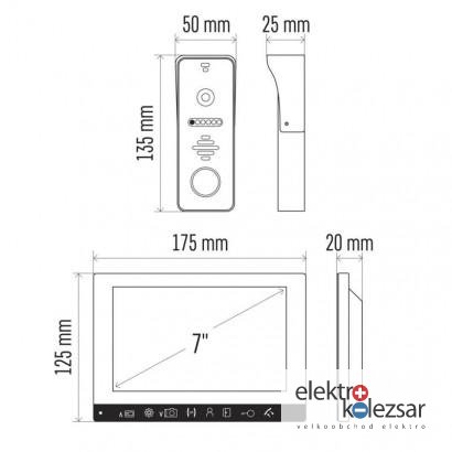 antivandal provedení kamerové jednotky: ano|aplikace pro vzdálenou správu: bez aplikace|automatické ukládání snímků: ano|barevný displej: ano|barva: stříbrná|doporučená kabeláž: FTP nebo SYKFY 5 × 2 × 0,5|dveřní zámek součástí balení: ne|intercom: ano|krytí kamerové jednotky: IP44|maximální úhel záběru kamery: 160°|montáž: na stěnu|možnost připojení přídavných kamer: ano|napájení kamerové jednotky: z monitoru|napájení monitoru: 12 V DC (součástí balení)|ovládání pojezdu brány: ano|ovládání zámku: ano|počet kamerových jednotek: 1|počet melodií: 10 + vlastní|počet monitorů: 1|počet propojovacích vodičů (monitor/zámek/brána): 4+0+2|počet tlačítek kamerové jednotky: 1|přísvit kamery: ano, do 150 cm|prodejní obal: 1 ks, krabice|regulace hlasitosti: ano|rozměr kamerové jednotky: 135 × 50 × 25 mm|rozměr monitoru: 175 × 125 × 20 mm|snímací prvek kamery: 2 Megapixel AHD (1080p)|velikost displeje: 7"|záruční doba: 2 roky|zdroj pro zámek součástí balení: ne|zdroj součástí balení: ano