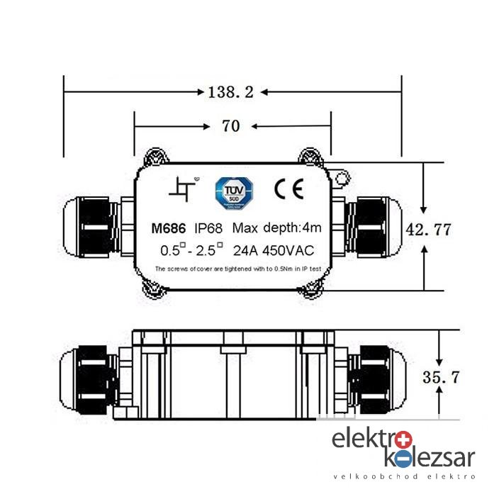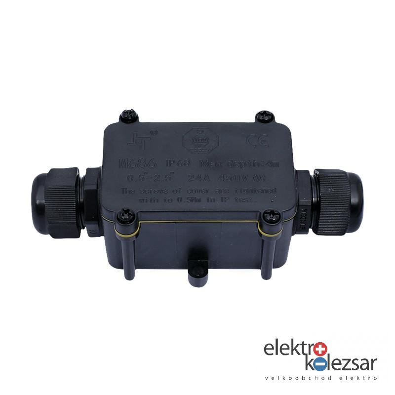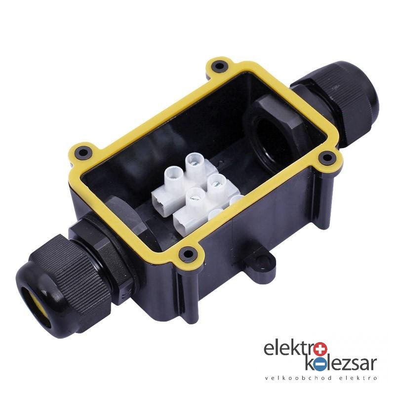 Vodotěsná propojovací krabička s jedním vstupem a jedním výstupem nabízí pohodlné a bezpečné propojení dvou- nebo třížilových vodičů. Díky krytí IP68 a odolné konstrukci zvládne použití i v extrémních podmínkách s možností krátkodobého ponoření do vody (max. 3 m, 48 hod.).