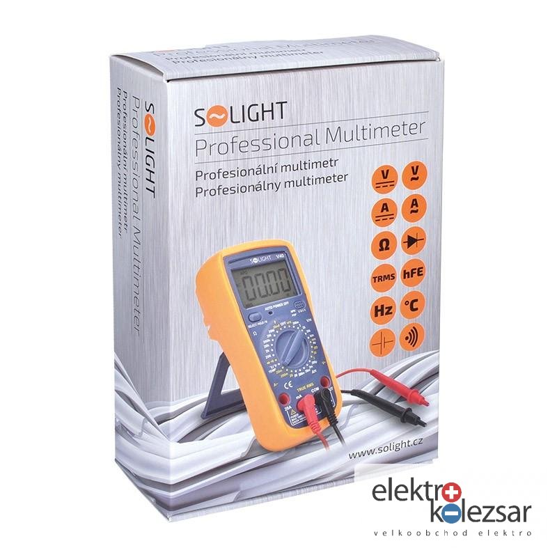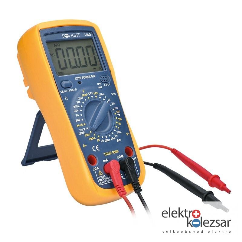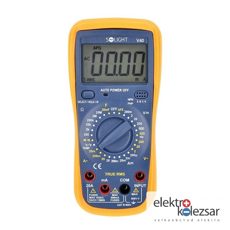 Digitální multimetr pro měření proudu, napětí, odporu, frekvence, kapacity a teploty. Nabízí true RMS měření (efektivní hodnota střídavých průběhů), tranzistorový a diodový test, test spojitosti obvodu, a měření parametrů hFE. Automatické vypnutí a uchování poslední hodnoty. Ochrana proti přetížení s elektronickou pojistkou. Napájení: 9V baterie. Rozsahy: DCV (200mV - 600V), ACV (2V - 600V), DCA (200µA - 20A), OHM (200? - 20M?), kapacita (20nF - 20mF), teplota (-40°C - 1000°C). Rozměry: 189 x 89 x 55 mm.