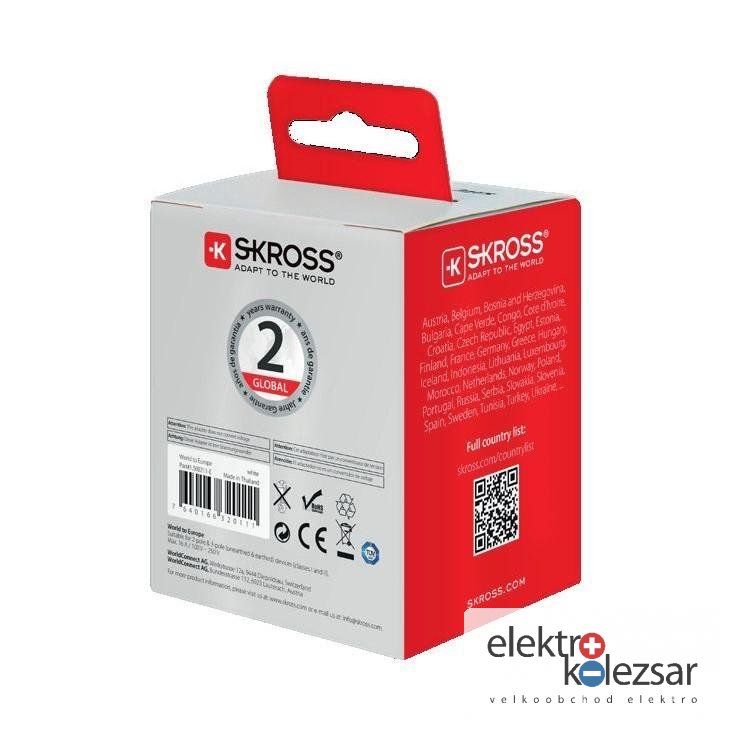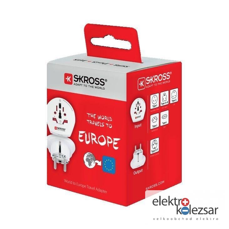 Adaptér SKROSS World to Europe umožňuje bezpečné použití zařízení z více než 200 zemí v českých a evropských zásuvkách typů E a F. Připojí uzemněné i neuzemněné vidlice přívodních kabelů, bez problémů zapojíte vše od notebooků, telefonů až po fény.